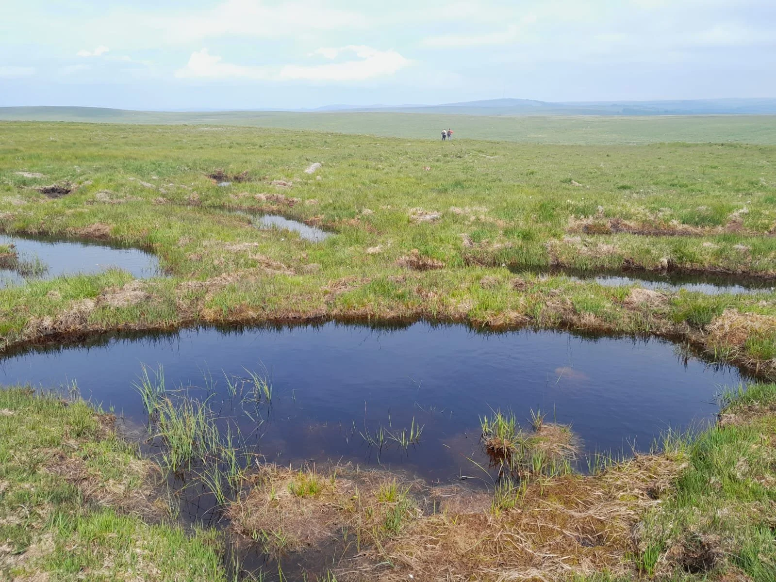 Pools of water formed behind peat bunds on site. The aim is that in time, these pools of water help to raise and stabilise the water table in the surrounding peat, and fill with peat-forming sphagnum mosses, as well as acting for a brilliant habitat for birds, insects and helping to diversify the surrounding number of bog plant species. From past experience at other restoration sites, long periods without substantial rain may leave some pools behind dams empty for a time. As long as the water was there initially, and it comes back with the rain, then that desired change in the vegetation will occur in time.